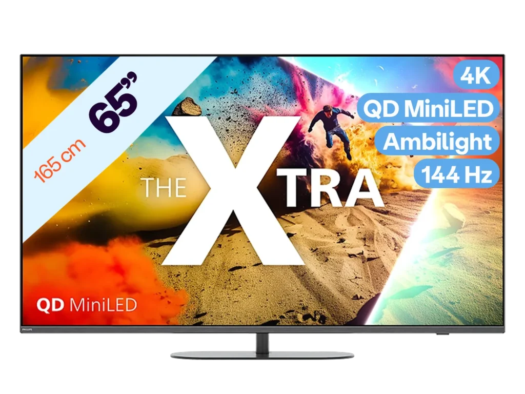De Philips The Xtra 65MLED950/12 combineert Quantum Dot MiniLED met slimme AI-beeldverwerking voor een helder, contrastrijk 4K-beeld.